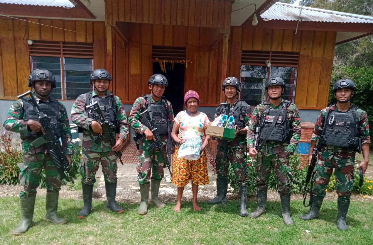 Selain melaksanakan silaturahmi dan memberikan sepatu untuk Mama Wendius, personel Pos Pirime pun memberikan sedikit sembako berupa kopi dan gula serta sedikit beras untuk kebutuhan sehari-hari.