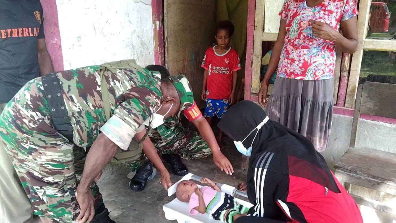 TIMIKA — Untuk kesekian kalinya Danramil 1710-07/Mapurujaya Lettu Inf Yakonias Maniagasi melaksanakan kunjungan sekaligus memberikan bantuan kepada anak kurang gizi (stunting) di wilayah binaan di Kp. Muare Distrik Mimika Timur, Kab. Mimika, Jumat (03/2/2023).