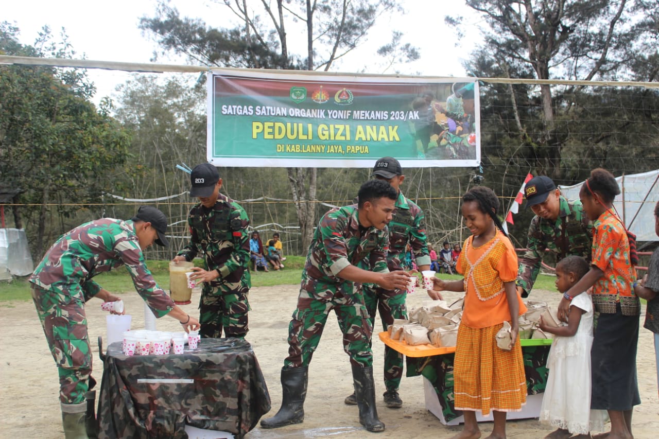 LANNYA JAYA – Demi meningkatkan gizi anak-anak di Pegunungan Tengah, Satgas Yonif Mekanis 203/AK mengadakan kegiatan makan bersama dan minum susu bersama dengan anak-anak dan masyarakat Desa Tima, Kabupaten Lanny Jaya, Senin (13/02/2023).