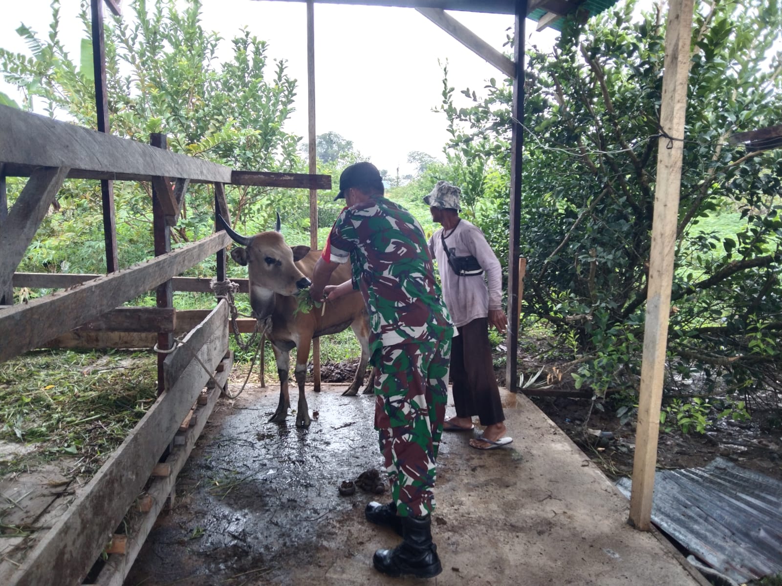 Seperti yang dilakukan oleh Babinsa Mapurujaya Serda Yulius Nyampe, ia melaksanakan pendampingan kepada Bapak Katio salah satu peternak Sapi Rambon di Kampung Muare, Distrik Mimika Barat, Kab. Mimika, Minggu (5/3/2023).