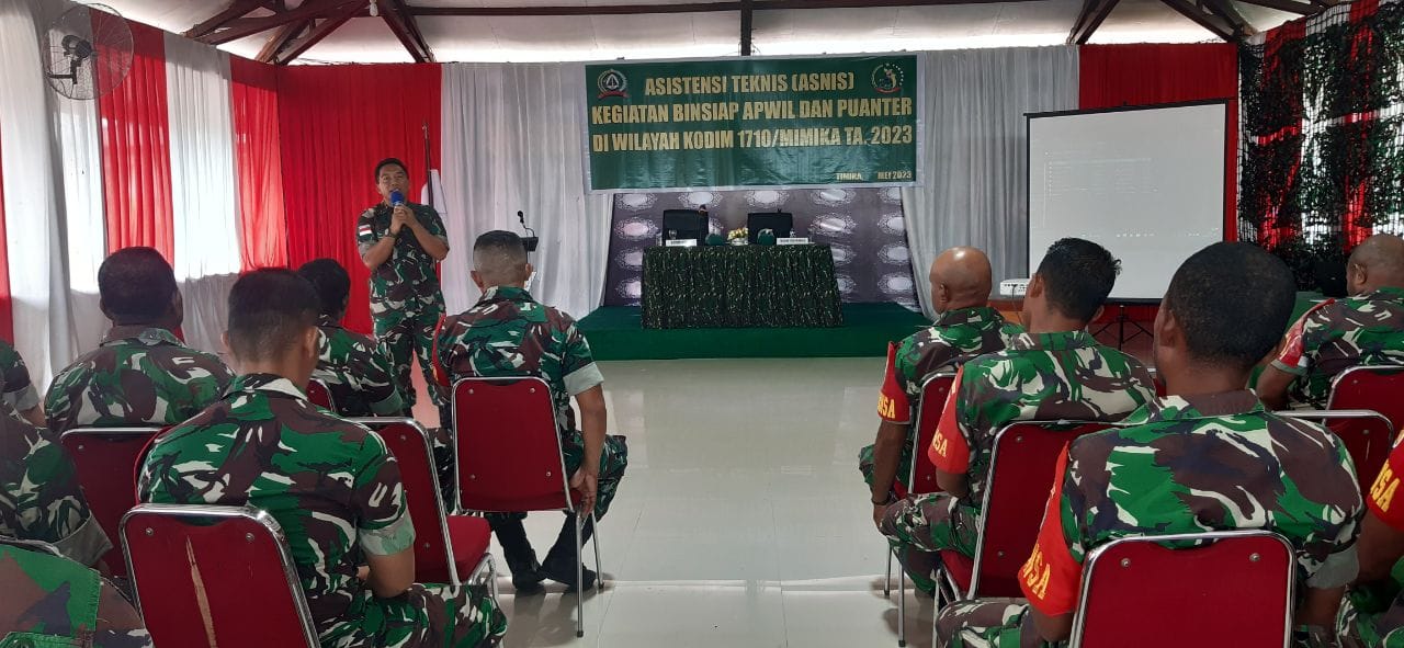 Timika — Guna terus meningkatkan kesiapan Prajurit dalam pelaksanaan pembinaan dan pertahanan di wilayah, Kodim 1710/Mimika menggelar kegiatan Asnis Binsiap Apwil Dan Puanter TA. 2023 bertempat di Aula Darmawangsa Makodim 1710/Mimika Jl. Agimuga Mile 32, Distrik Kuala Kencana, Kab. Mimika, Senin (15/05/2023).